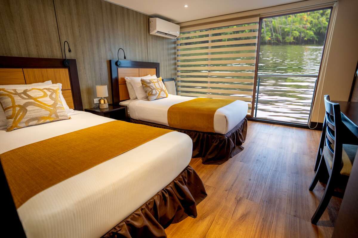 Bienvenue à bord ! Le confortable bateau de croisière fluviale Anakonda offre, outre les merveilles de la forêt tropicale, une expérience unique à bord. Les cabines confortables ont une surface de plus de 20 m2 et sont dotées de fenêtres panoramiques et même, pour certaines, de balcons. Pendant la croisière le long du fleuve Napo, des excursions passionnantes vous attendent : vous vous promènerez dans la jungle dense, traquerez les caïmans et observerez les oiseaux, les singes et les dauphins. De retour à bord, vous serez choyés avec des plats exquis.