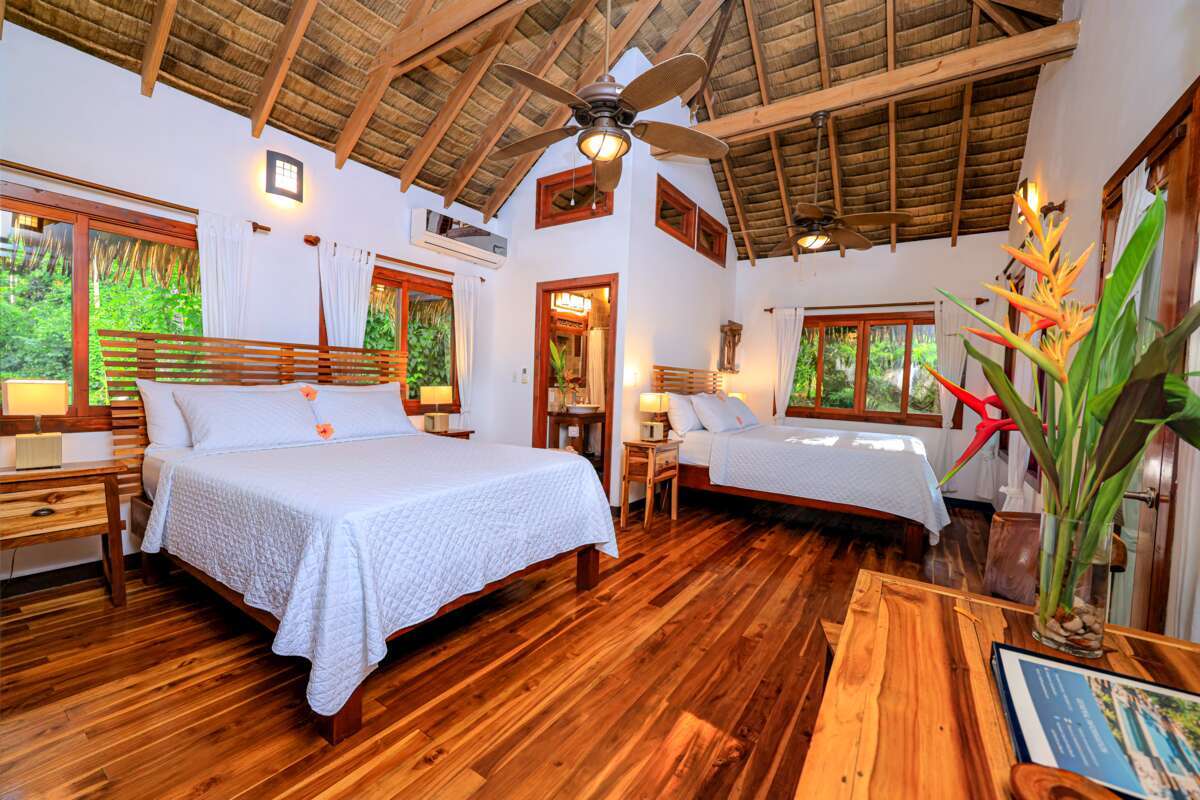 Freistehenden Luxury-Cabins, alle mit Hartholzböden, Balkon, Hängematte und Blick auf Ozean oder Regenwald. Die Cabins bieten viel Platz und Privatsphäre, einige sind zweistöckig. Zur Infrastruktur gehören ein offenes Strandrestaurant, Bar sowie ein Swimmingpool.