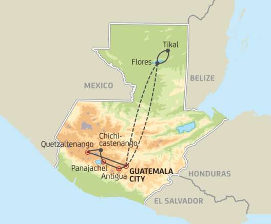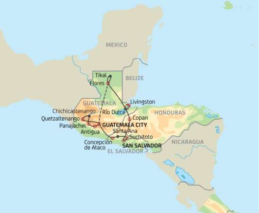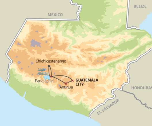 Guatemala ist bekannt als das Land des ewigen Frühlings, als Heimatland der Mayas und als ein Land der Gegensätze. Eindrückliche Vulkane, interessante Ausgrabungs-Stätten und farbenfrohe Märkte warten darauf, entdeckt zu werden. Nicht verpassen sollten Sie Tikal, eine der wohl schönsten Maya-Stätten der Welt, mitten im guatemaltekischen Dschungel gelegen. Auch die Besuche des Atitlan-Sees und des berühmten Marktes in Chichicastenango sollten auf Ihrer Reise nicht fehlen. Ein weiterer Höhepunkt ist der Aufenthalt im pittoresken Antigua. Sie ist eine der ältesten Städte des Kontinents und wird von den drei Vulkanen Agua, Fuego und Acatenango überragt. Apropos Vulkane – wie wäre es zum Beispiel mit einem zweitägigen Trekking auf den Gipfel des Tajumulco-Vulkan (4220m), dem höchsten Berg Guatemalas?