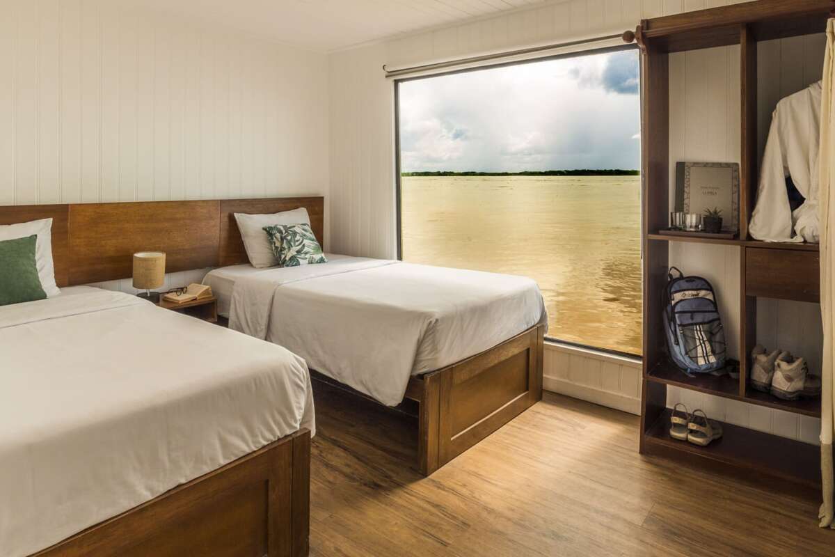 Total 14 Kabinen aufgeteilt in Standard-, Amazon View- und Superior-Kabinen, einige mit Zugang zu geteiltem Balkon. Alle Kabinen haben Klimaanlage und grosse Fenster. Speiseraum, Beobachtungsdeck mit Lounge im Innen- und Aussenbereich sowie Hängematten.