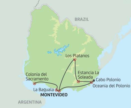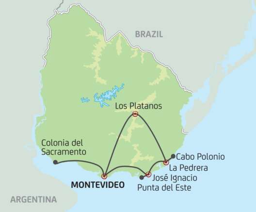 Ein kontrastreiches Land, das kleine, eher unbekannte Uruguay. Bunte Häuserfassaden, kopfsteingepflasterte Gässchen und koloniale Prachtbauten verzieren das Antlitz der Städte Montevideo und Colonia de Sacramento. In den verwinkelten Gassen der Altstadt spürt man auf Schritt und Tritt die koloniale Vergangenheit. Das Gegenteil erwartet den Reisenden im mondänen Punta del Este mit seinen fein sandigen Badestränden. In den Sommermonaten begegnet sich hier, zwischen schicken Luxushotels und eleganten Villen, die südamerikanische High Society. Uruguay mit seinen endlosen Weideflächen und den riesigen Viehzuchtbetrieben ist zudem ein Land der Farmer. Verschiedene Estancias (Grossgrundbesitze) öffnen ihre Türen für Touristen und bieten Einblick in die alltäglichen Aktivitäten einer Grossfarm.