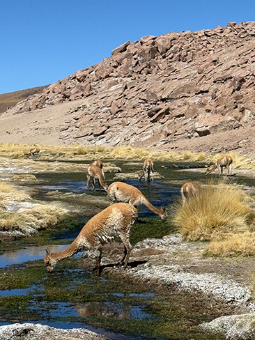 Komplett anders (und ebenso beeindruckend) zeigt sich der Norden Chiles. Bizarre Felsformationen, rote Erde und auftürmende Dünen wecken das Gefühl, man sei auf dem Mars gelandet. Herden rosafarbener Flamingos ziehen ruhig ihre Bahnen durch Salzseen, während nebenan friedlich eine Gruppe Vikunjas rastet. Die Atacama zählt zu den trockensten Regionen der Erde und ist ein Ort der Extreme: Tagsüber brennt die Sonne, nachts wird es überraschend kalt – und dennoch pulsiert das Leben.
